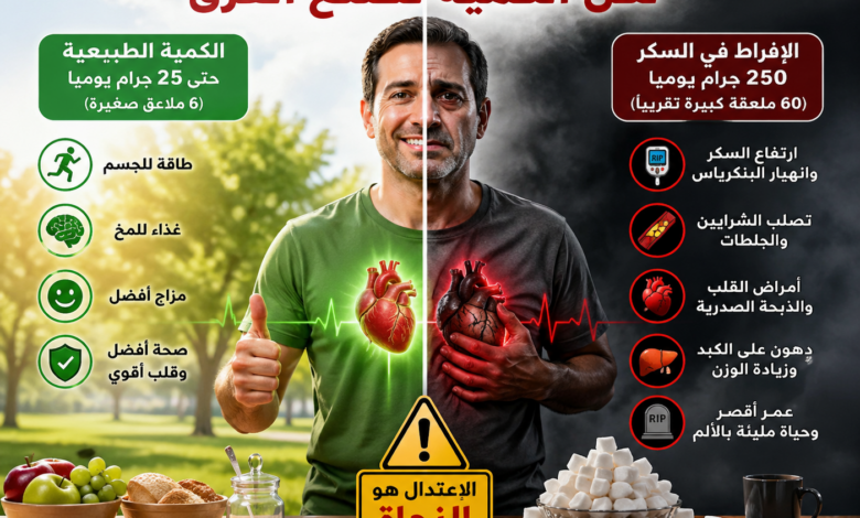 السكر ليس عدوًا لكن تحويله إلى عادة يومية مفرطة هو انتحار بطيء 25 جرام آمن 250 جرام خطر حقيقي